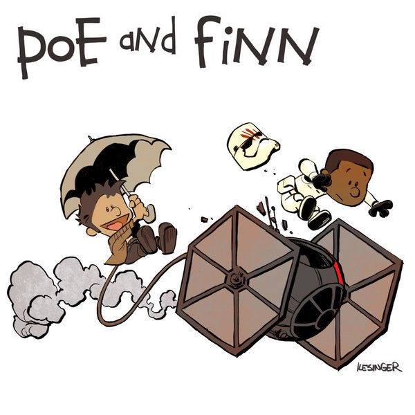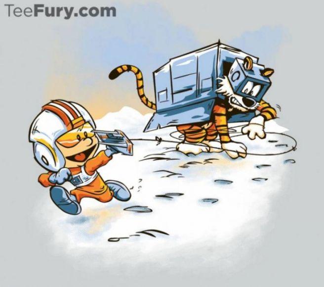 Brian Kesinger ,famoso illustratore Americano di scuola Disney, ci ha regalato una serie di fantastiche illustrazioni in cui immagina un mash-up tra il famoso fumetto di Watterson e la saga di Star Wars. Le immagini ripropongono i 2 personaggi animati in alcune delle scene più famose dell’ultimo film e alcune immaginate dall’artista.
