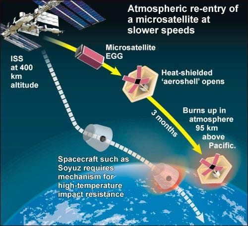 I ricercatori hanno testato questo nuovo metodo di rientro nell’atmosfera terrestre su un microsatellite denominato EGG, avvalendosi di un scudo che protegge dal calore per riportare a terra il microsatellite in maniera “soft”, qualcosa di molto simile a ciò che avviene con i paracadute.